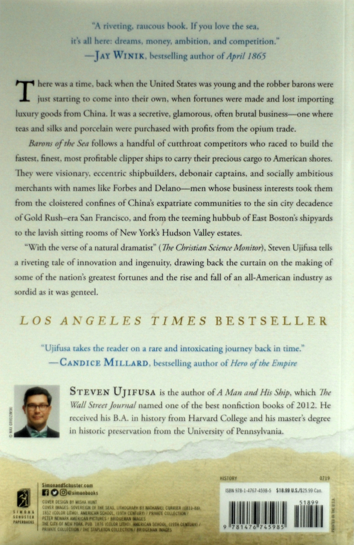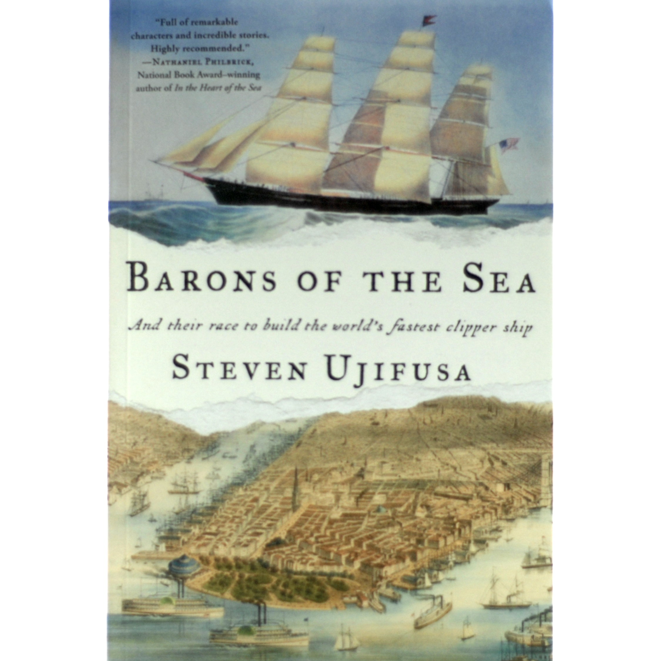 Barons of the Sea follows a handful of cutthroat competitors who raced to build the fastest, finest, most profitable clipper ships to carry their precious cargo to American shores. They were visionary, eccentric shipbuilders, debonair captains, and socially ambitious merchants with names like Forbes and Delano – men whose business interests took them from the cloistered confines of China’s expatriate communities to the sin city decadence of Gold Rush-era San Francisco, and from the teeming hubbub of East Boston’s shipyards to the lavish sitting rooms of New York’s Hudson Valley estates.